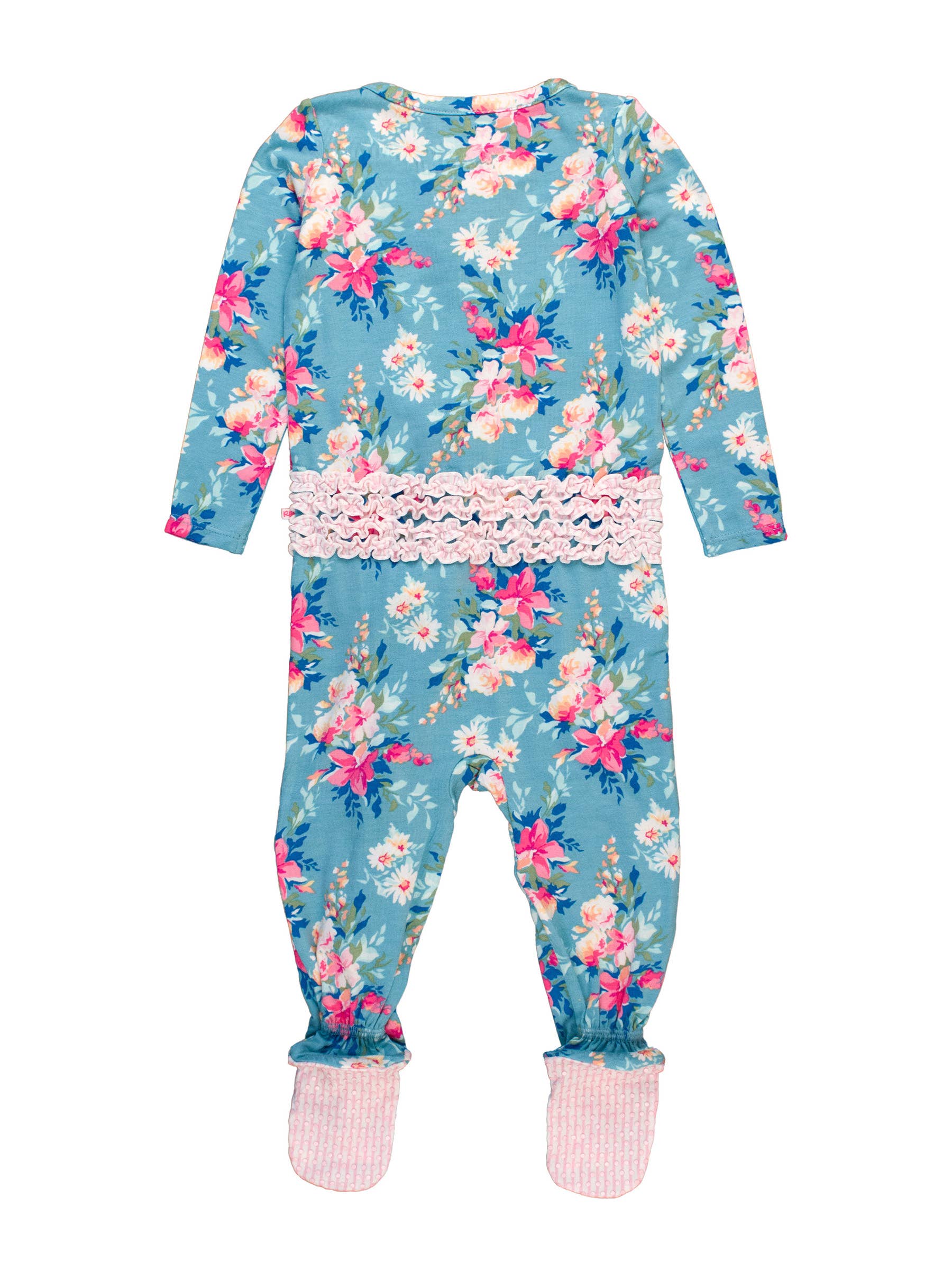 Fancy Me Floral Bamboo Viscose Footed Ruffle One Piece Pajama: Blue