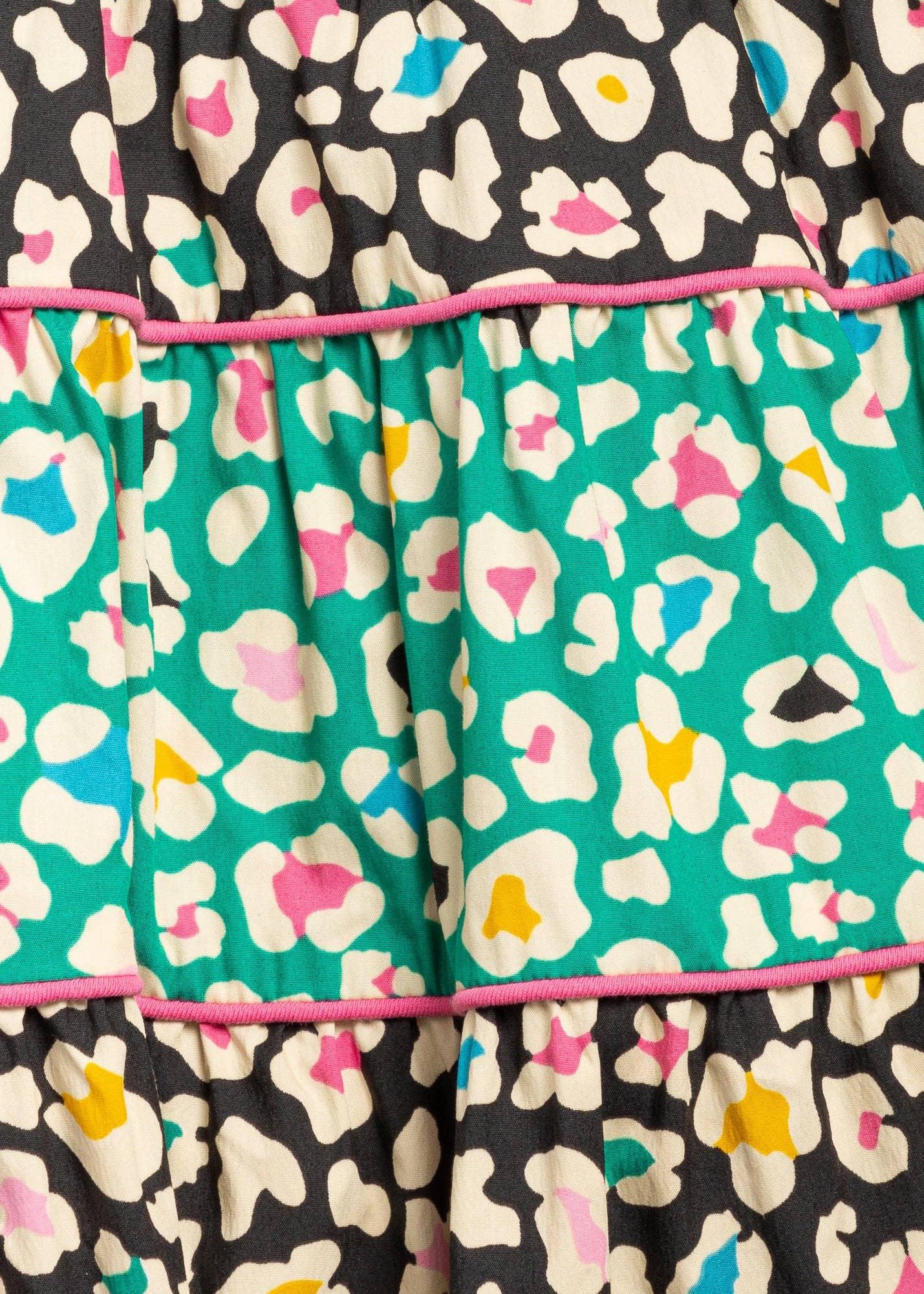 The City Kitty Dress has arrived to help your gal take a walk on the wild side! In a magical mix of Rainbow Leopard prints with princess-approved dropped shoulders and a tiered woven skirt, this dress is full of color and twirl power!
