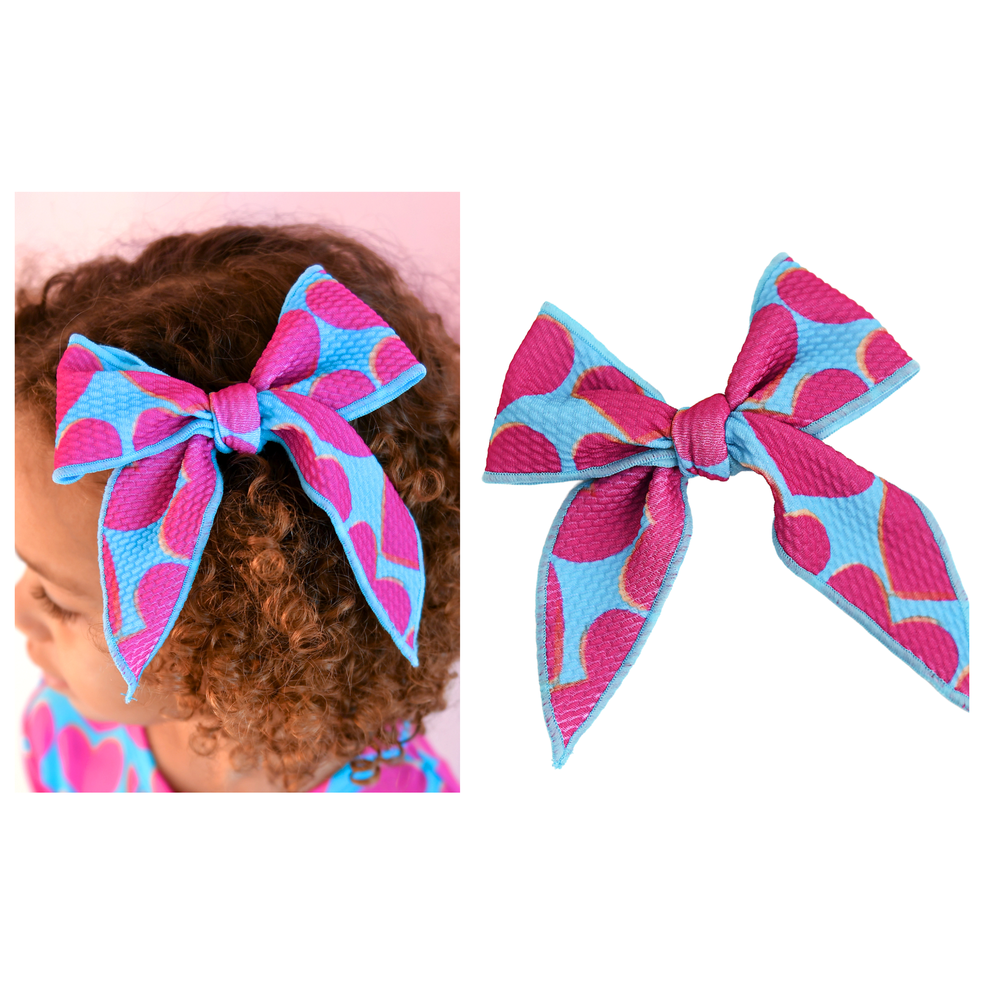 Our adorable clip bow is made from soft, textured bullet fabric and features a sturdy alligator clip on the back- ideal for side parts, ponytails, or any sweet hairstyle.