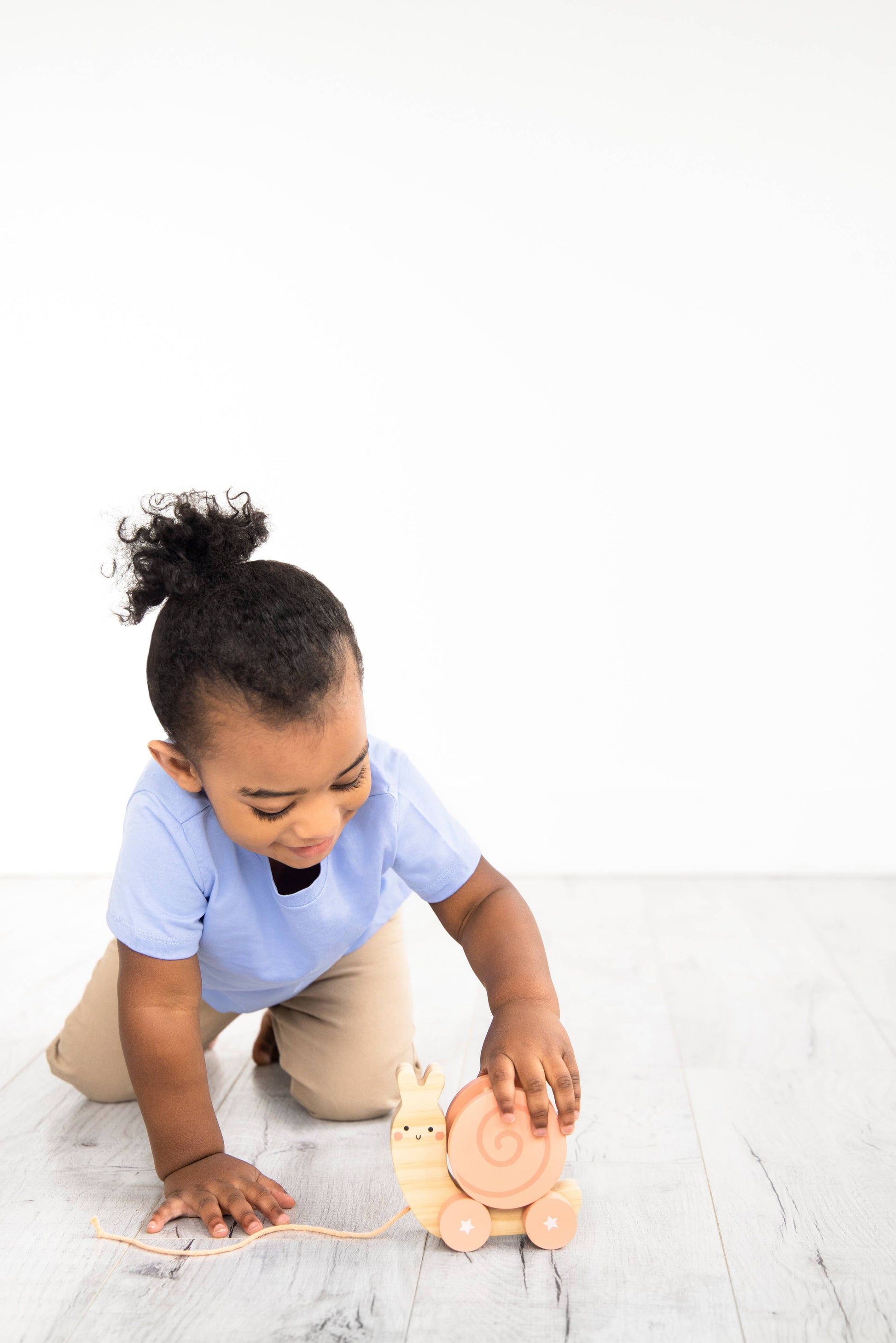 • Classic Character Design: This learning toy features 4 wheels and an attached easy to grasp long string to push and pull the friendly snail throughout your home